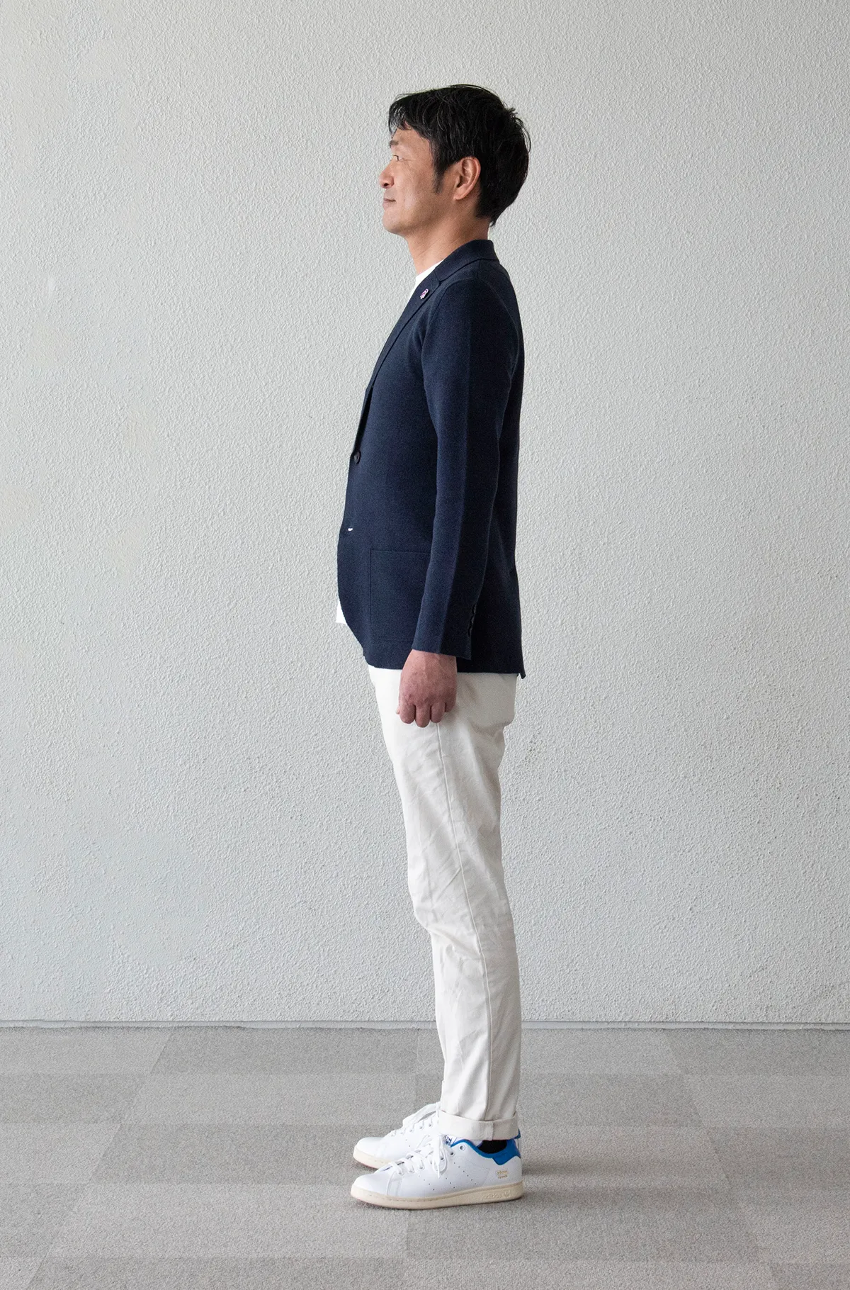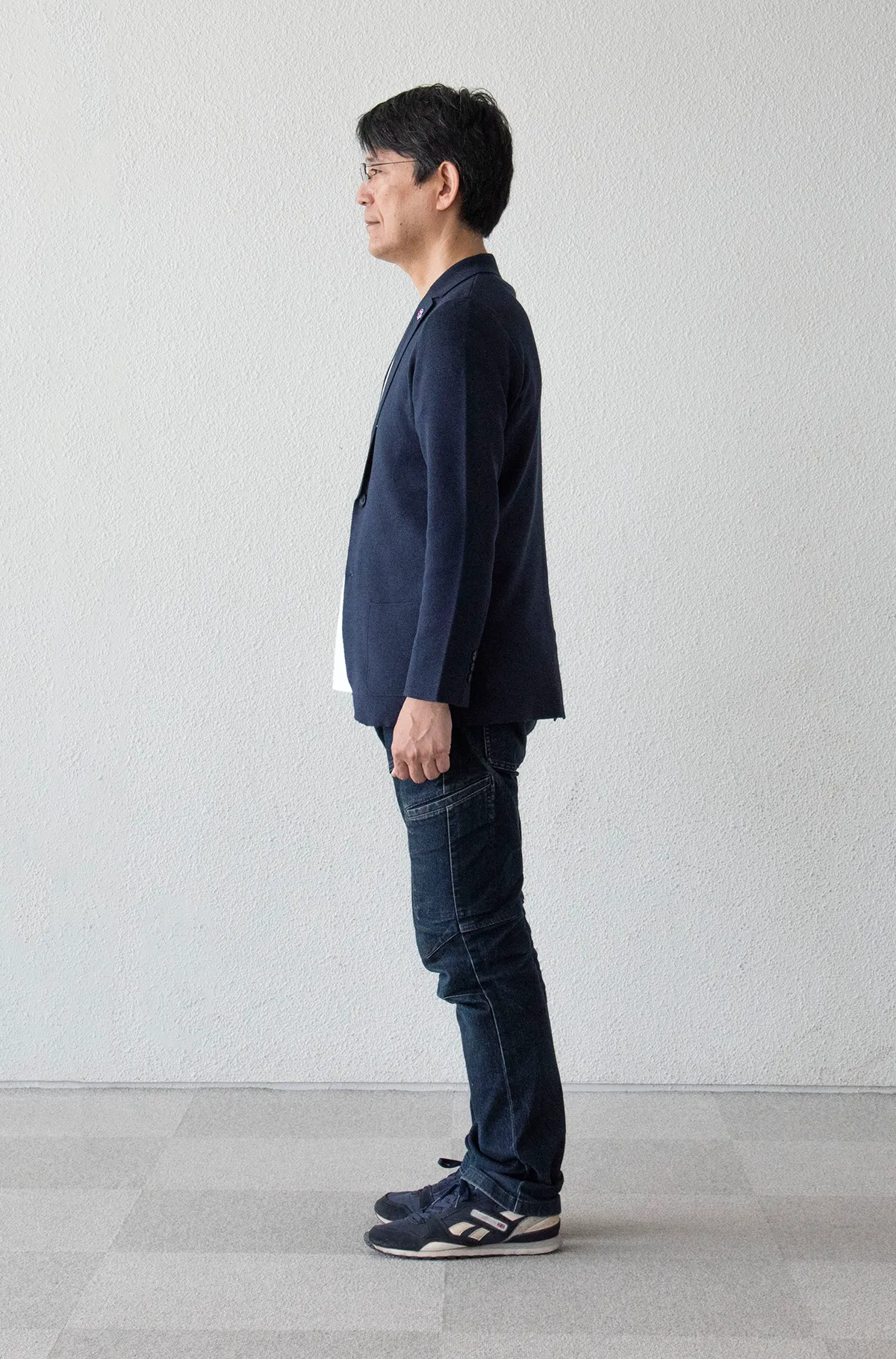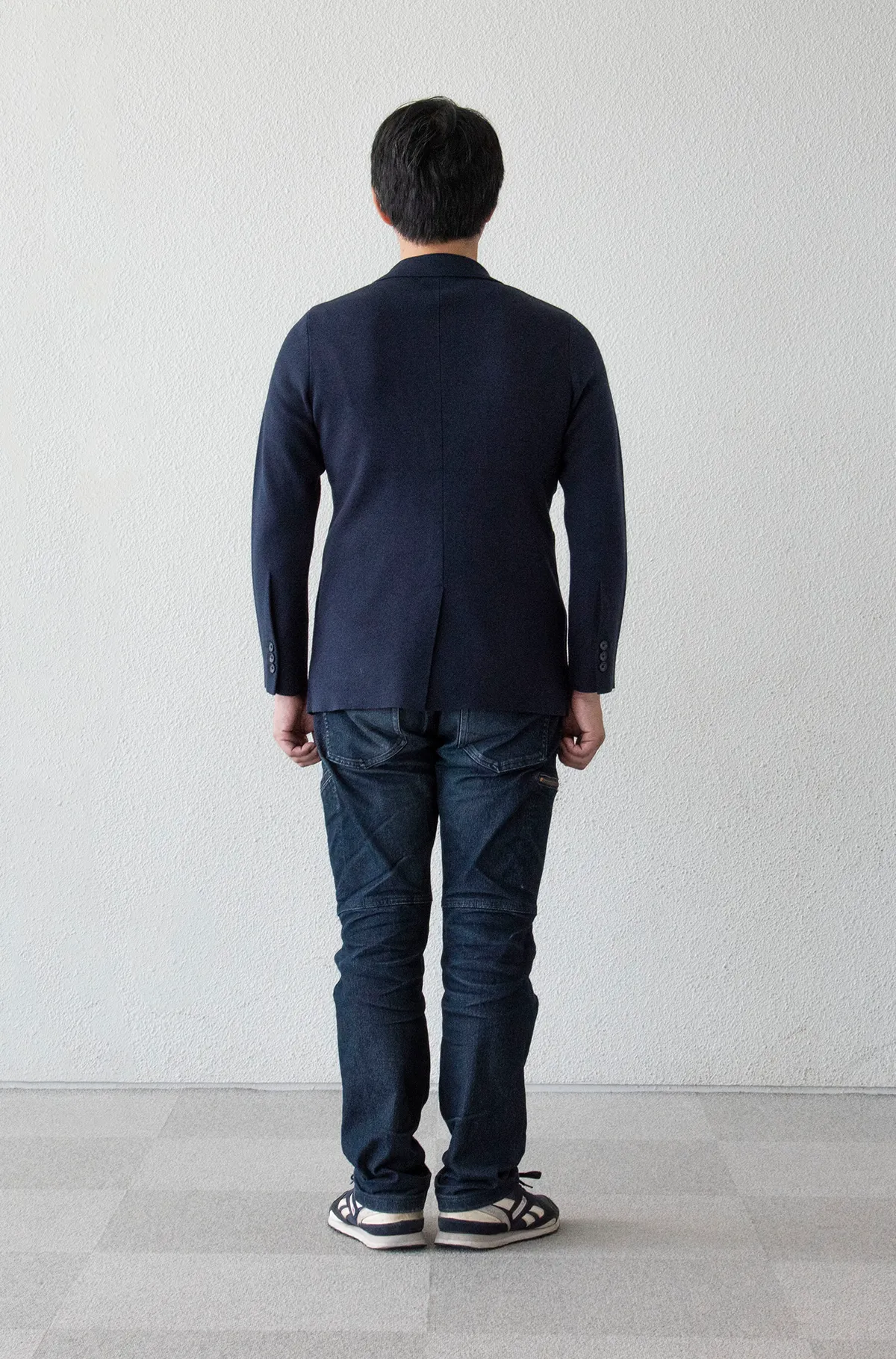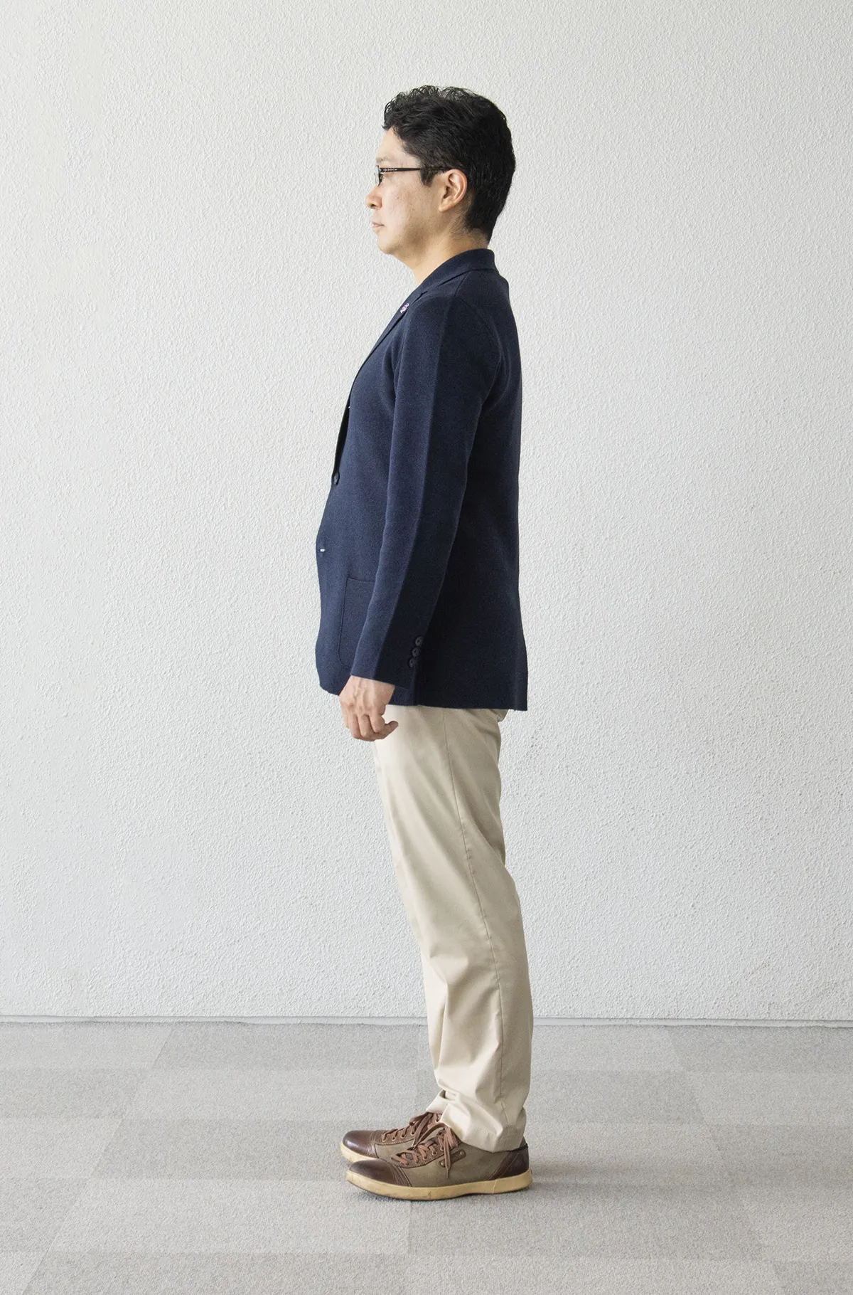 フェイバニッツのニットジャケットは、生地と縫い目に伸縮性が有るので、織物ジャケットほどのゆとり寸法は必要ありません。