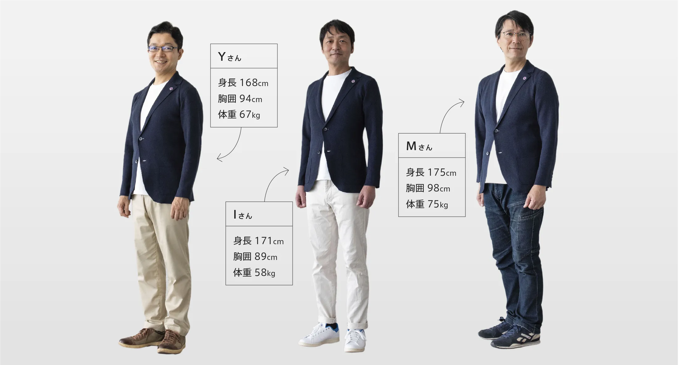 その上で、ぴったりとジャストフィットでお召しになるか、ゆったりとリラックスフィットでお召しになるか、お好みの着こなし方をお選びください。